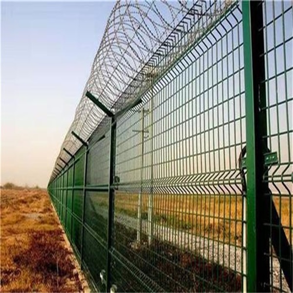 机场封闭围界也叫机场安全防御围界,是由V型支架立柱,加强型焊接片网,安全防盗连接件和不锈钢刀片刺笼组成,网身强度和安全防御性级别很高,机场封闭围界采用电镀、热镀、喷塑、浸塑等防腐形式,具有很好的抗老化、抗晒、耐候、安全性高等特点,网片连接方式采用优质螺丝连接,有效防止人为的破坏性拆卸,横向四道折弯加强筋,使网面强度显著增加,这就是机场围界具备极高的防攀爬能力的优势。